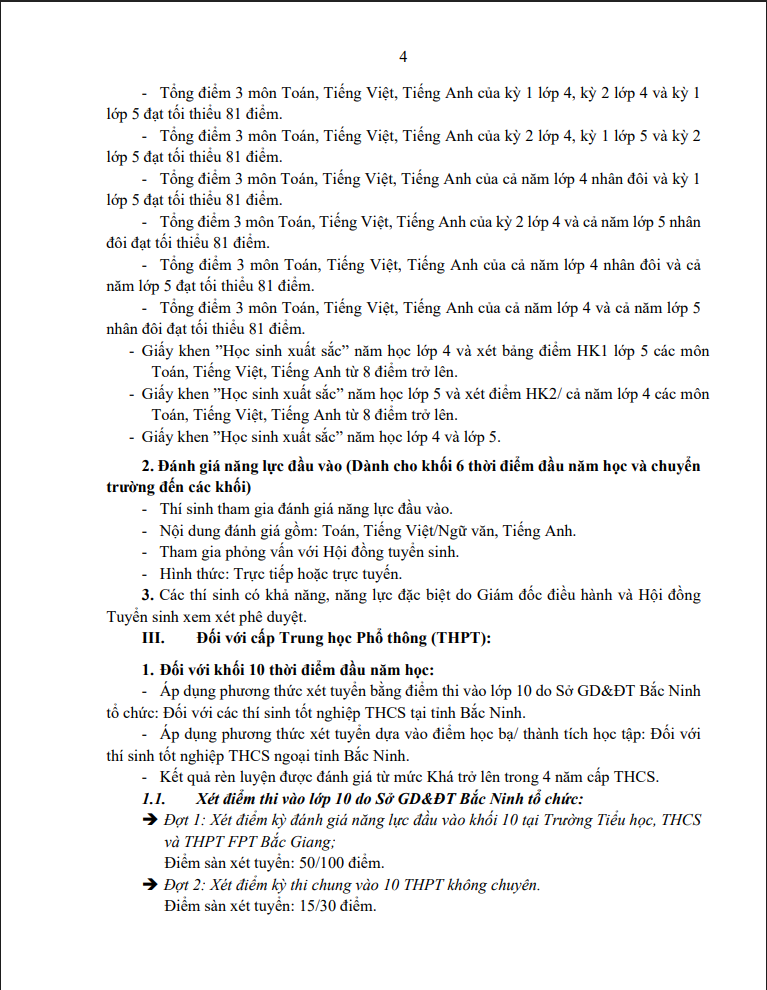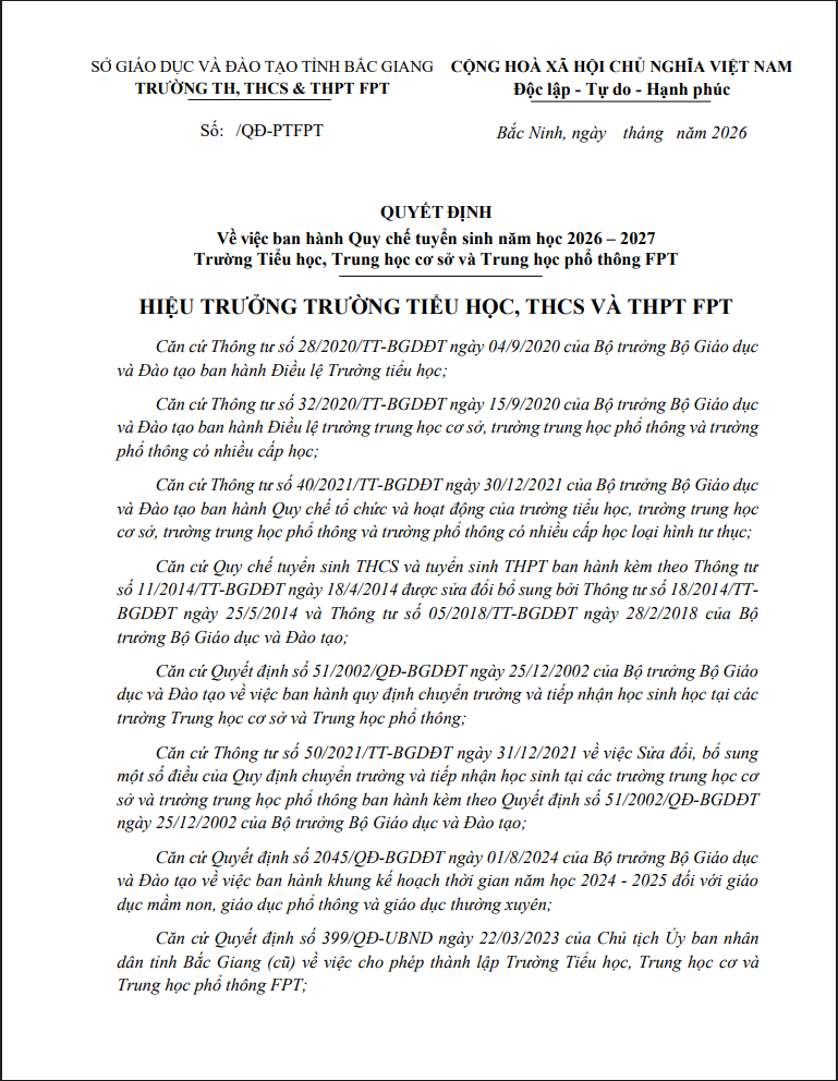 Nhằm chuẩn bị tốt nhất cho công tác tiếp nhận và đồng hành cùng thế hệ học sinh mới, Trường Tiểu học, THCS & THPT FPT Bắc Giang chính thức ban hành Quy chế tuyển sinh năm học 2026 - 2027.