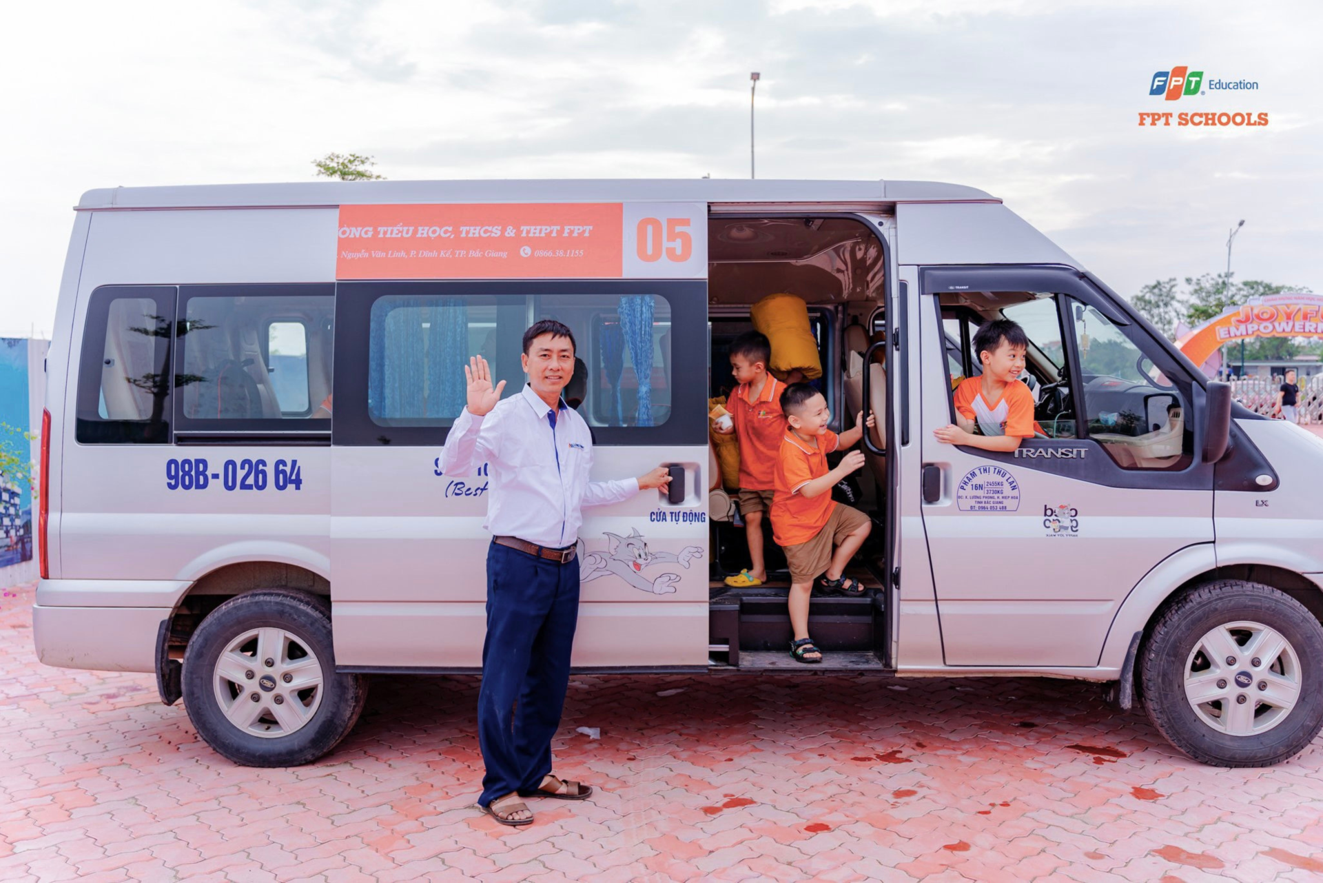 Đầu năm học, Nhà trường lựa chọn đơn vị cung cấp dịch vụ vận tải có kinh nghiệm và uy tín để tổ chức hoạt động đón trả học sinh có nhu cầu sử dụng dịch vụ. Xe tuyến được đưa vào sử dụng là xe ô tô đời mới (không quá 05 năm) loại 16 hoặc 29 chỗ (tùy theo số lượng và nhu cầu học sinh) được trang bị đầy đủ điều hòa không khí, trang thiết bị y tế, camera hành trình theo quy chuẩn, có dán logo FPT Schools và thường xuyên được vệ sinh sạch sẽ.