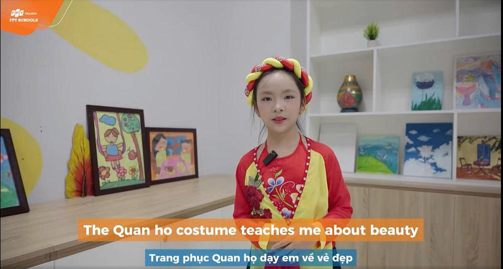 Tiêu biểu là Cuộc thi Nói Tiếng Anh Speak Out Loud – chương trình được phát động vào dịp hè dành cho học sinh FPT Schools Bắc Giang. Trong không gian học tập mở, học sinh tự tin sử dụng tiếng Anh để giới thiệu, trình diễn và chia sẻ góc nhìn của mình về trang phục Quan họ. Qua từng bài nói, hình ảnh áo tứ thân, nón quai thao, khăn mỏ quạ không chỉ được gọi tên bằng một ngôn ngữ mới, mà còn được các em tiếp cận ở chiều sâu giá trị thẩm mỹ, ý nghĩa văn hoá và tinh thần của vùng đất Kinh Bắc.
