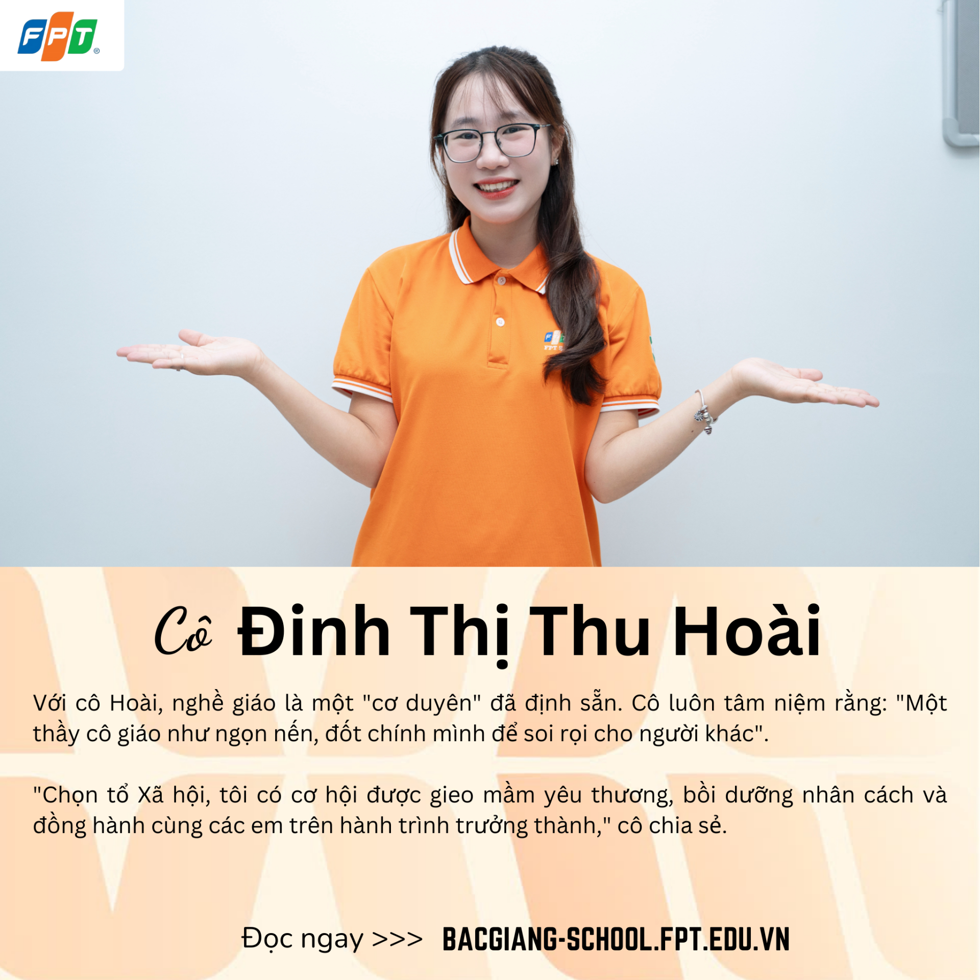 Cuối cùng, cô Hoài muốn gửi một thông điệp chân thành đến toàn thể học sinh: "Các em hãy luôn giữ trong tim mình một ngọn lửa – ngọn lửa của ước mơ, của niềm tin và của khát vọng. Hãy dám bước đi, dám thử thách và dám sai, bởi mỗi trải nghiệm, mỗi vấp ngã đều là cơ hội để trưởng thành. Thầy cô luôn ở đây để đồng hành, để tin tưởng và để nhìn thấy các em tỏa sáng trên con đường của chính mình."