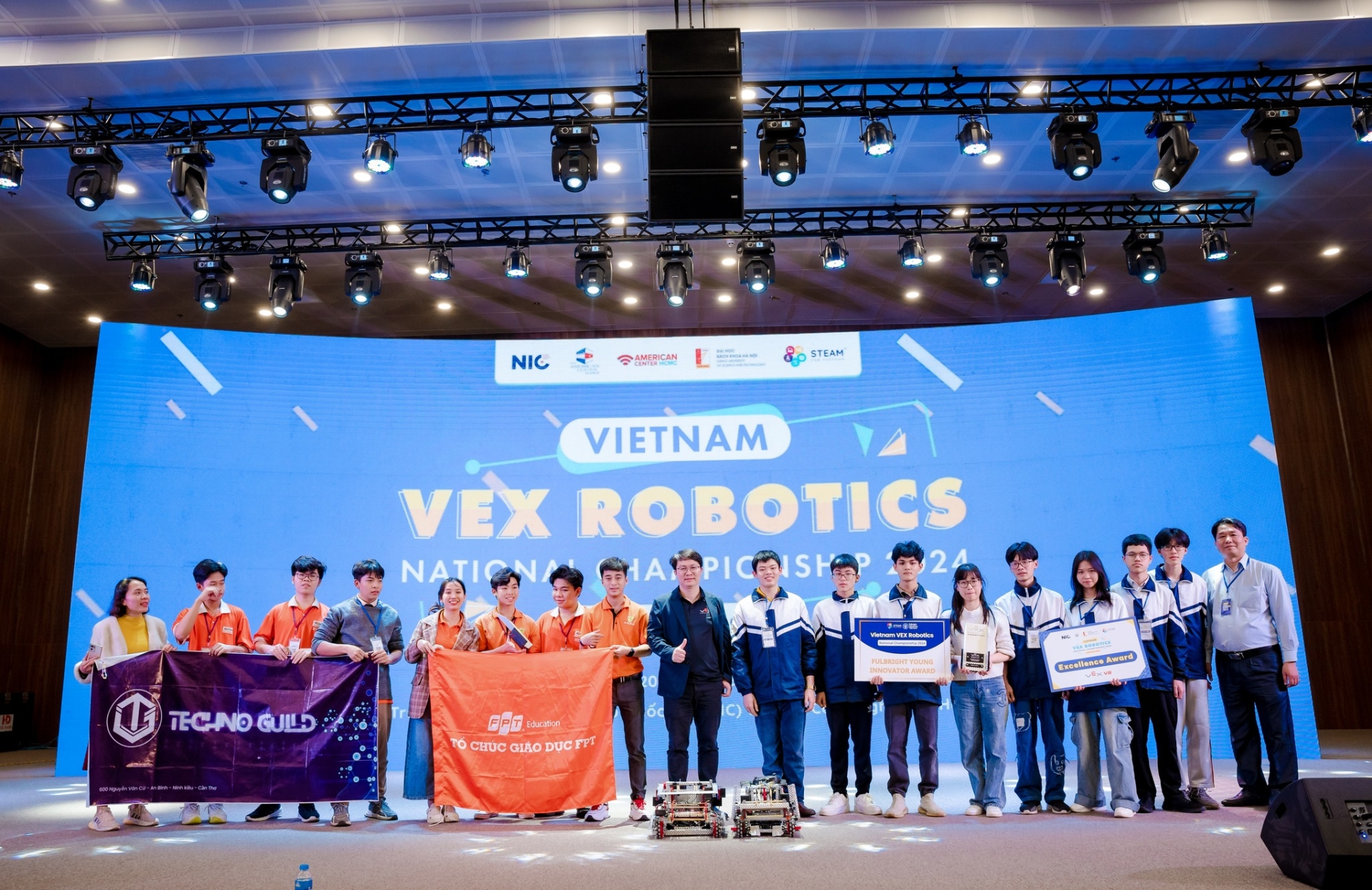 Sau hàng loạt trận đấu tranh tài trong khuôn khổ giải Vô địch Quốc gia VEX Robotics 2024, diễn ra từ ngày 20/01 đến ngày 21/01 tại Trung tâm Đổi mới sáng tạo Quốc gia (NIC) – Khu Công nghệ cao Hòa Lạc, Thạch Thất, Hà Nội, đội Enterprise đến từ FPT School Cần Thơ đã xuất sắc đạt giải Vô địch Liên minh, hạng mục VEX V5 Robotics. Cùng với đó, đội FschoolCG San Hô Trắng đến từ Fschool Cầu Giấy cũng mang về giải Build Award (Giải Lắp ráp), hạng mục VEX IQ Robotics.