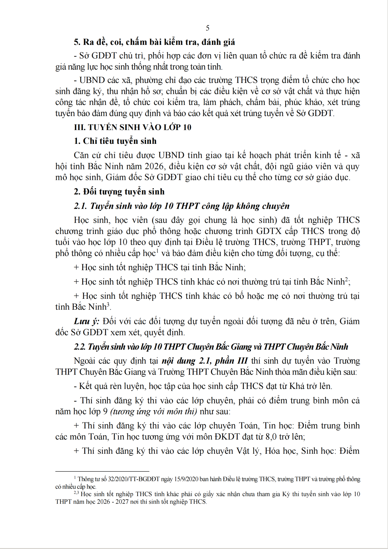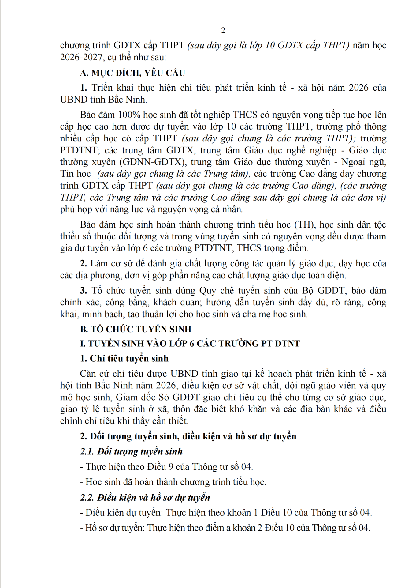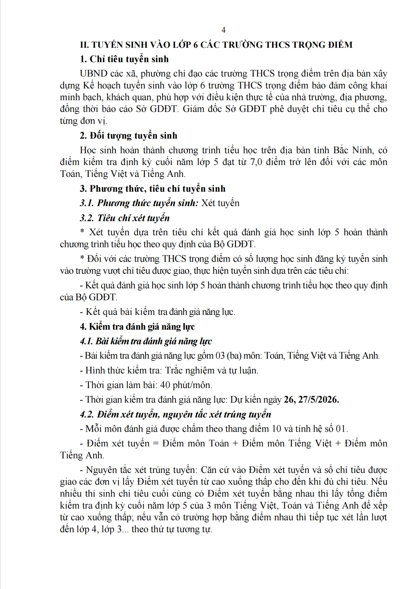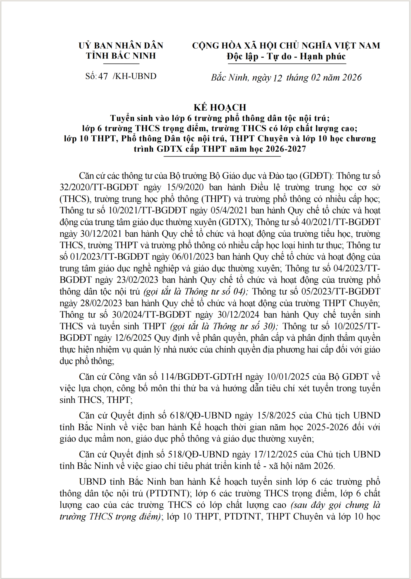 KẾ HOẠCH TUYỂN SINH LỚP 6 VÀ LỚP 10 CÁC TRƯỜNG THCS & THPT TRÊN ĐỊA BÀN TỈNH BẮC NINH, NĂM HỌC 2026-2027Tác giảVũ Tuấn15:18 - 24/02/2026 File chi tiết: Tải xuống ke-hoach-so-47-cua-ubnd-tinh.pdfChia sẻ: