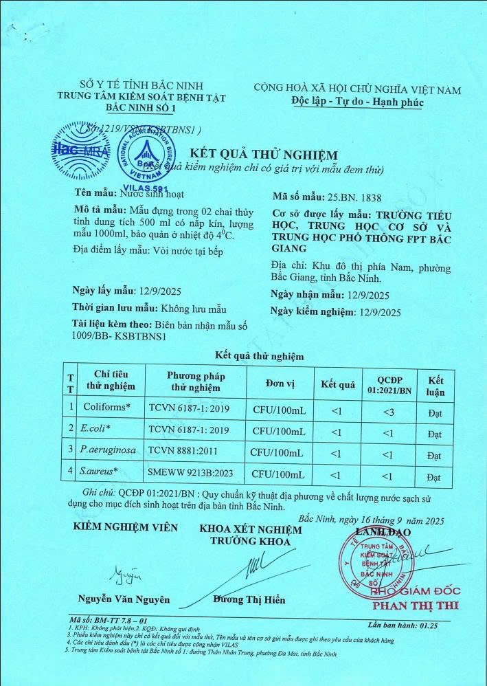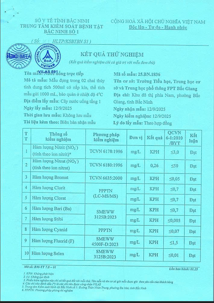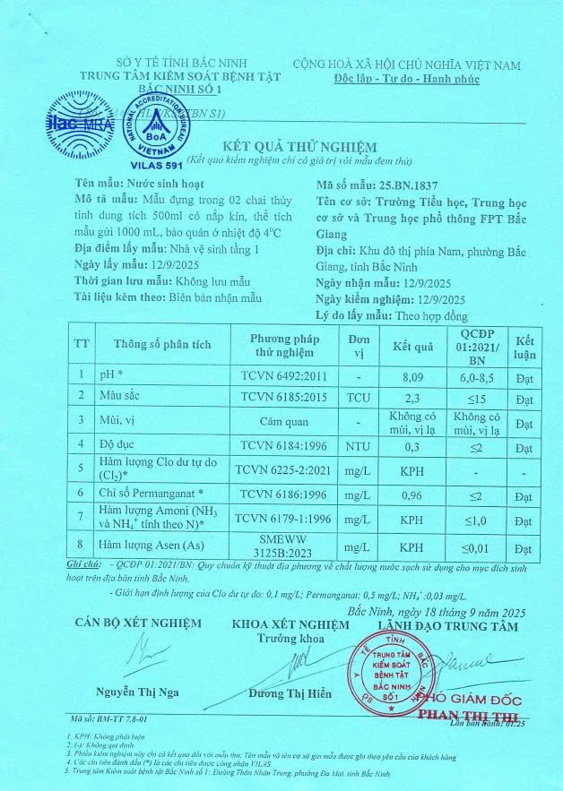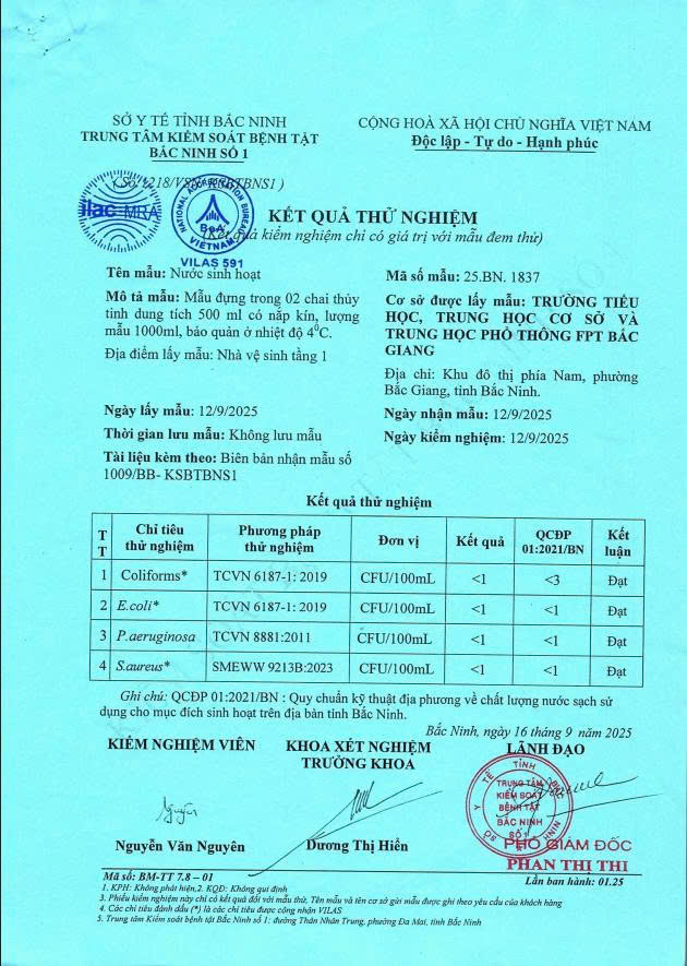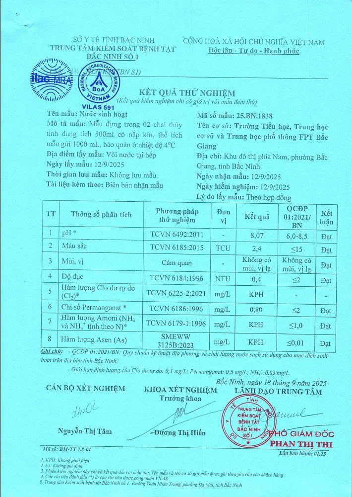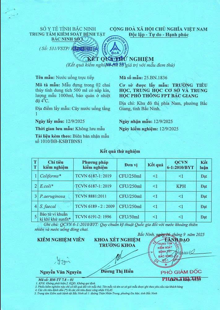 Kết quả cho thấy cả 03 mẫu nước được lấy tại Trường Tiểu học, THCS & THPT FPT Bắc Giang đều đạt tiêu chuẩn an toàn, cụ thể: