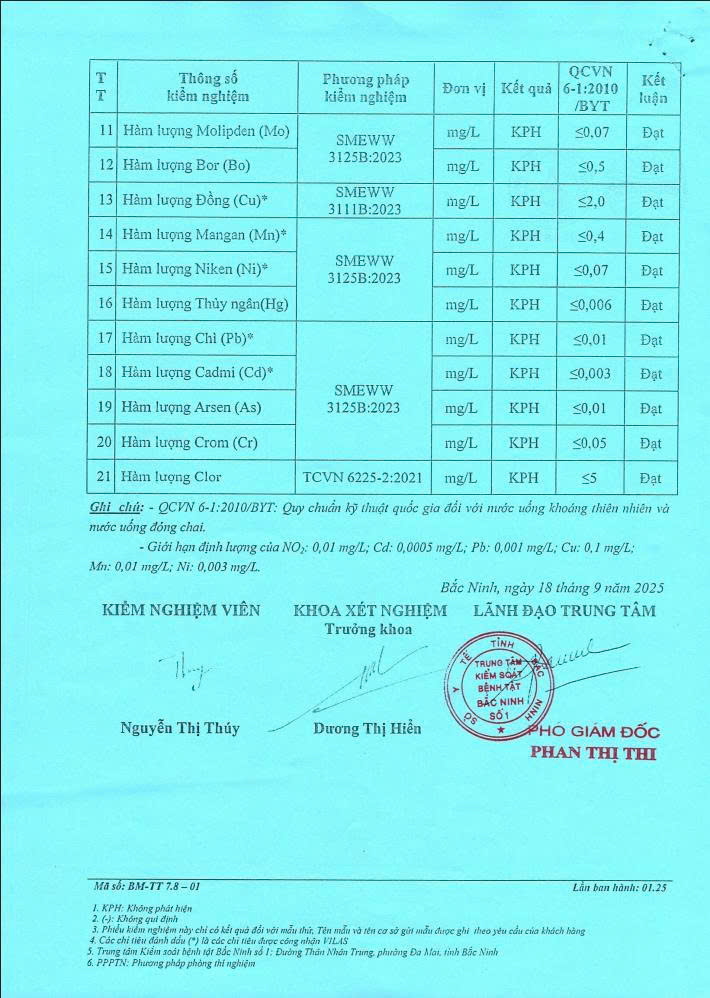 Các chỉ tiêu vi sinh (Coliforms, E.Coli, Pseudomonas aeruginosa...) không phát hiện.