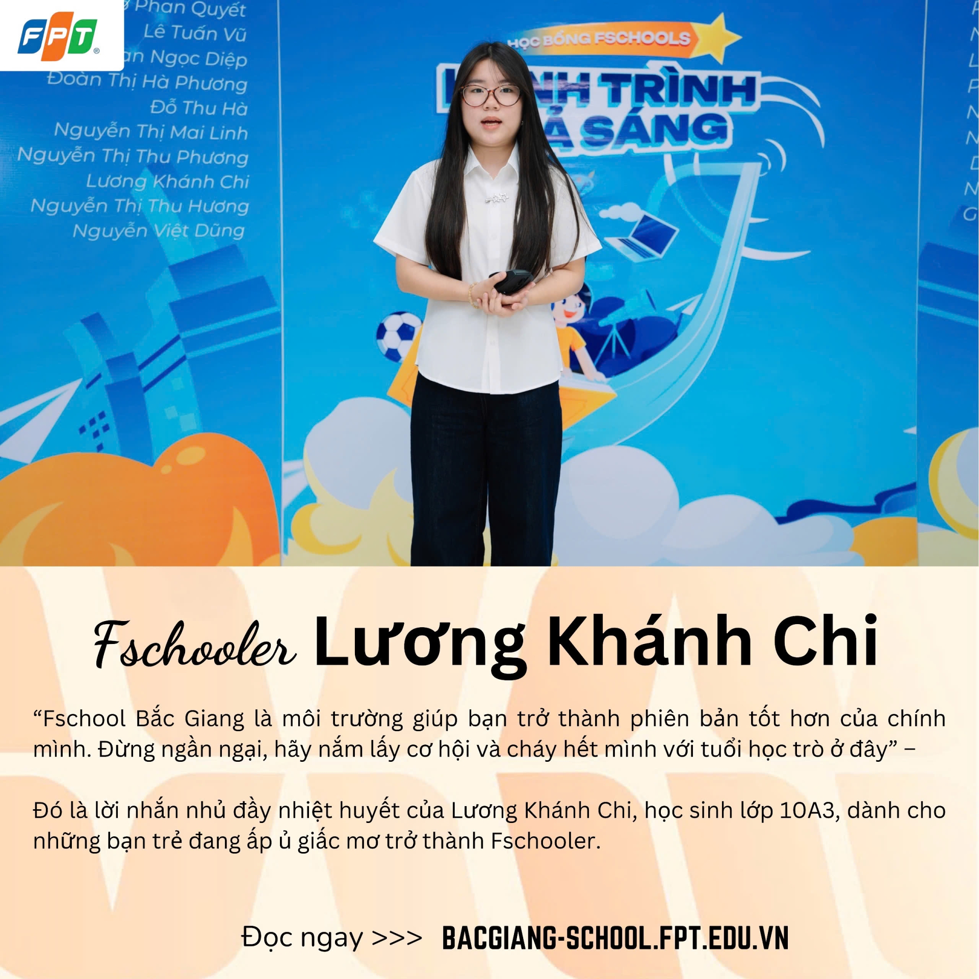 “Fschool Bắc Giang là môi trường giúp bạn trở thành phiên bản tốt hơn của chính mình. Đừng ngần ngại, hãy nắm lấy cơ hội và cháy hết mình với tuổi học trò ở đây” – đó là lời nhắn nhủ đầy nhiệt huyết của Lương Khánh Chi, học sinh lớp 10A3, dành cho những bạn trẻ đang ấp ủ giấc mơ trở thành Fschooler.