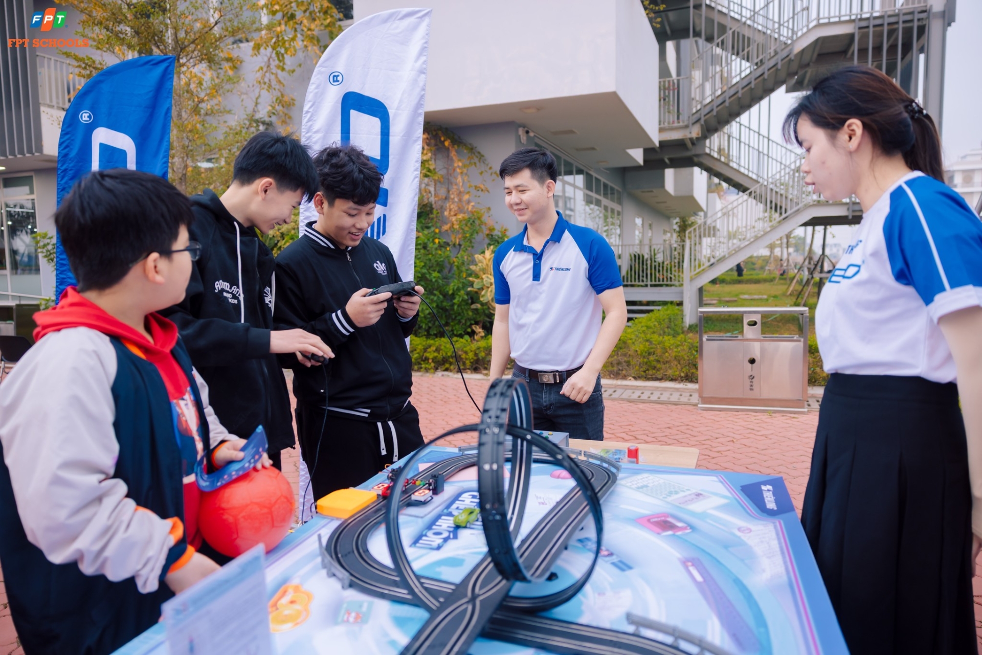 Tại sự kiện, hơn 20 gian hàng STEM – Công nghệ – Robotics được tổ chức bài bản, tạo nên không gian học tập mở, nơi học sinh được trực tiếp trải nghiệm, khám phá và tương tác. Các khu vực như VR Future Zone, Robotics, STEAM Arena, Amazing Race – xe thế năng, Camera 360 & Photobooth… mang đến cơ hội để học sinh tiếp cận kiến thức khoa học, kỹ thuật thông qua hoạt động thực hành sinh động, lan tỏa tinh thần “học mà chơi – chơi mà học”.