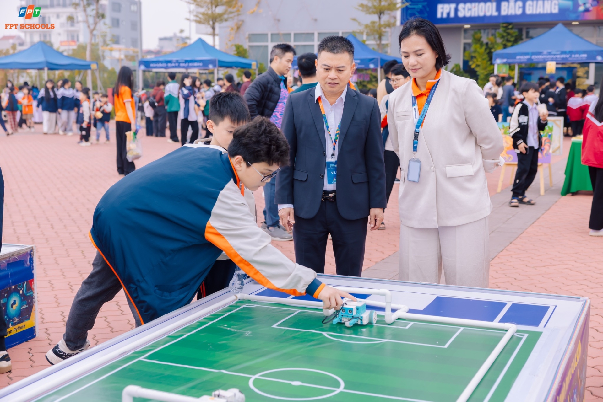 Một điểm nhấn nổi bật của OPEN STEM DAY 2025–2026 là khu vực FANROC (AI & Robotics). Tại đây, học sinh Tiểu học và THCS FPT School Bắc Giang đã tự tin trình diễn các sản phẩm lập trình, điều khiển robot, thể hiện tư duy logic, khả năng ứng dụng công nghệ và tinh thần chủ động trong môi trường giáo dục số.