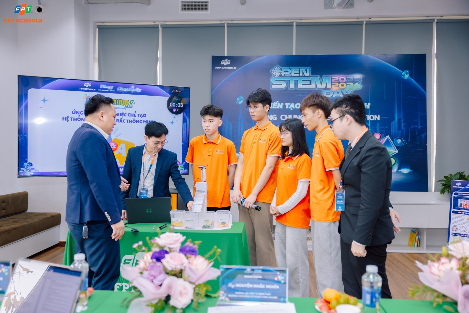 Trong khuôn khổ OPEN STEM DAY 2025–2026, vòng Chung kết STEMPTITION được tổ chức, ghi dấu ấn với nhiều dự án khoa học – công nghệ sáng tạo do chính học sinh nghiên cứu và phát triển. Các sản phẩm dự thi cho thấy khả năng vận dụng kiến thức liên môn, tư duy giải quyết vấn đề và tinh thần nghiên cứu nghiêm túc của học sinh FPT School Bắc Giang.
