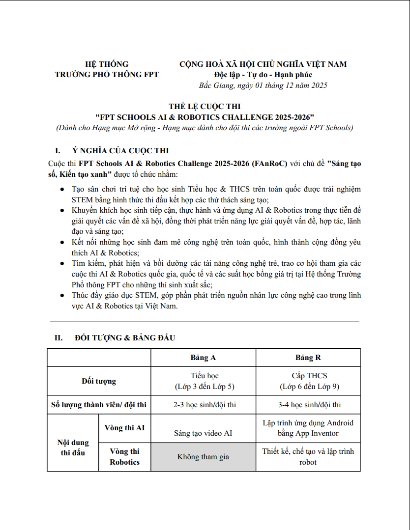THỂ LỆ CUỘC THI "FPT SCHOOLS AI & ROBOTICS CHALLENGE 2025-2026”Tác giảVũ Tuấn14:00 - 01/12/2025 Chia sẻ: