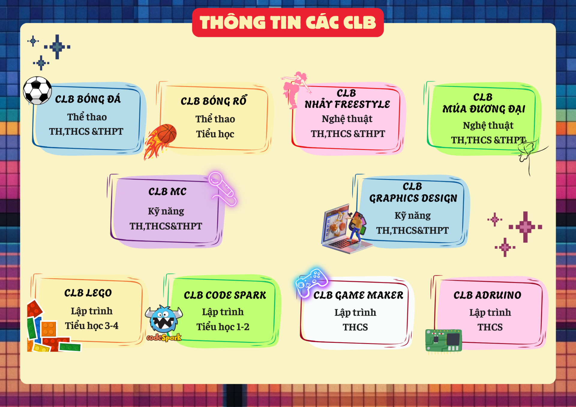 Lĩnh vực Thể thao: CLB Cờ vua, CLB Bóng đá, CLB Bóng rổ.