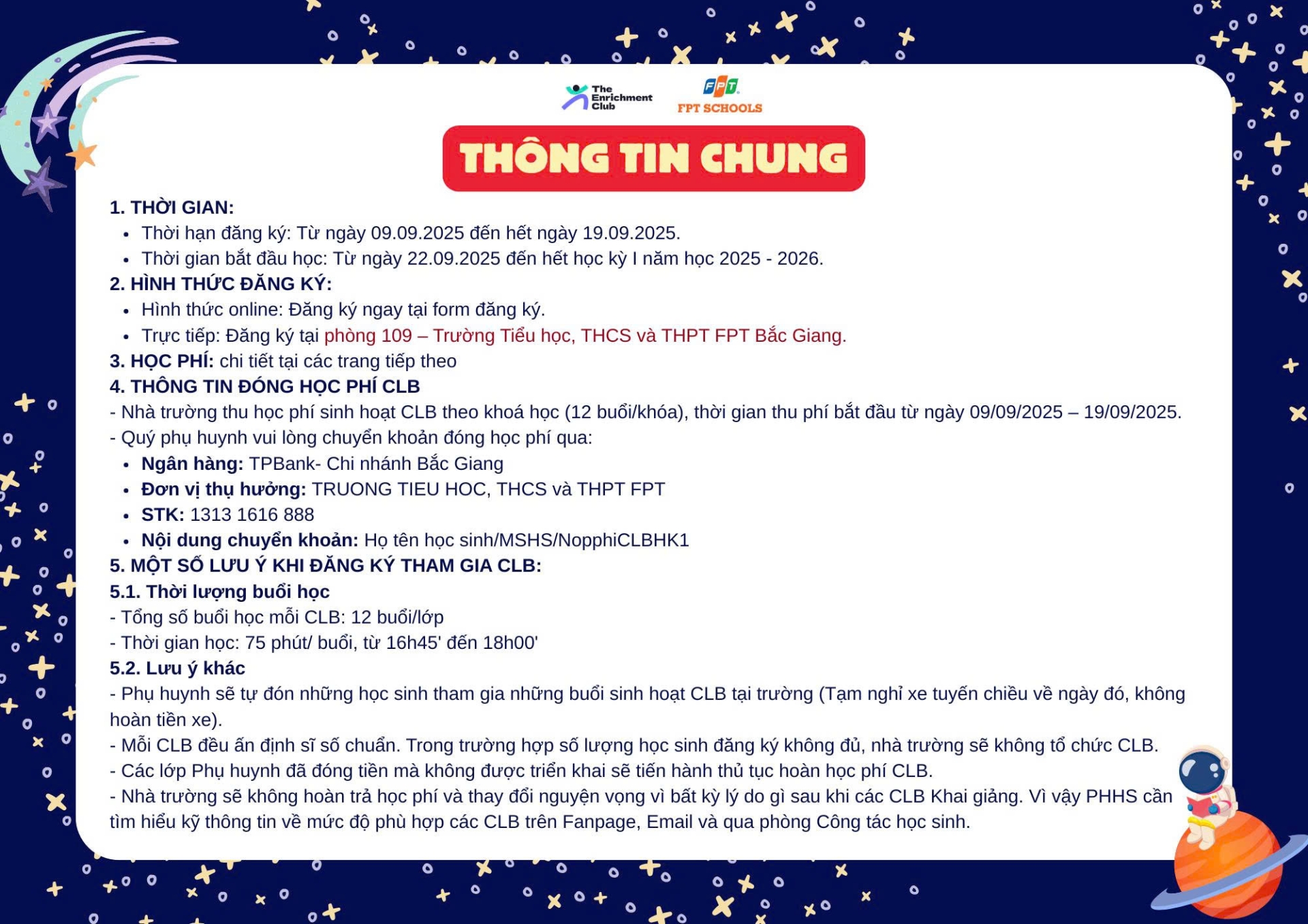 Mỗi CLB có sĩ số tối thiểu – tối đa. CLB không đủ số lượng sẽ không triển khai (Nhà trường sẽ hoàn học phí).