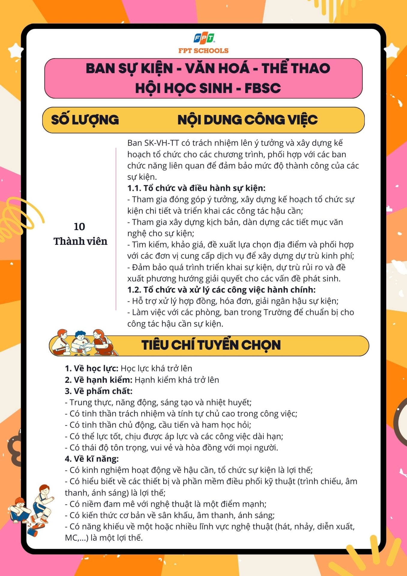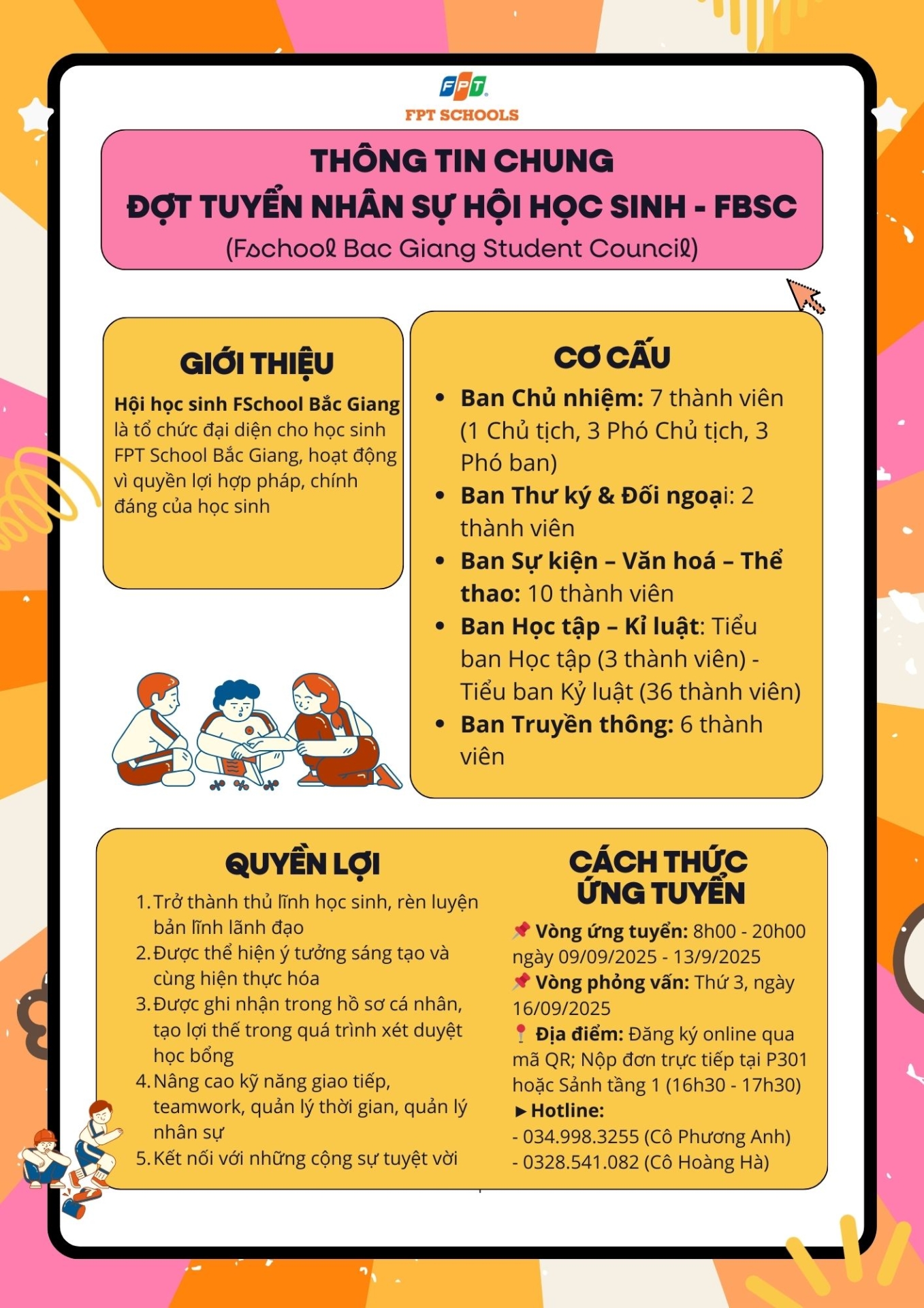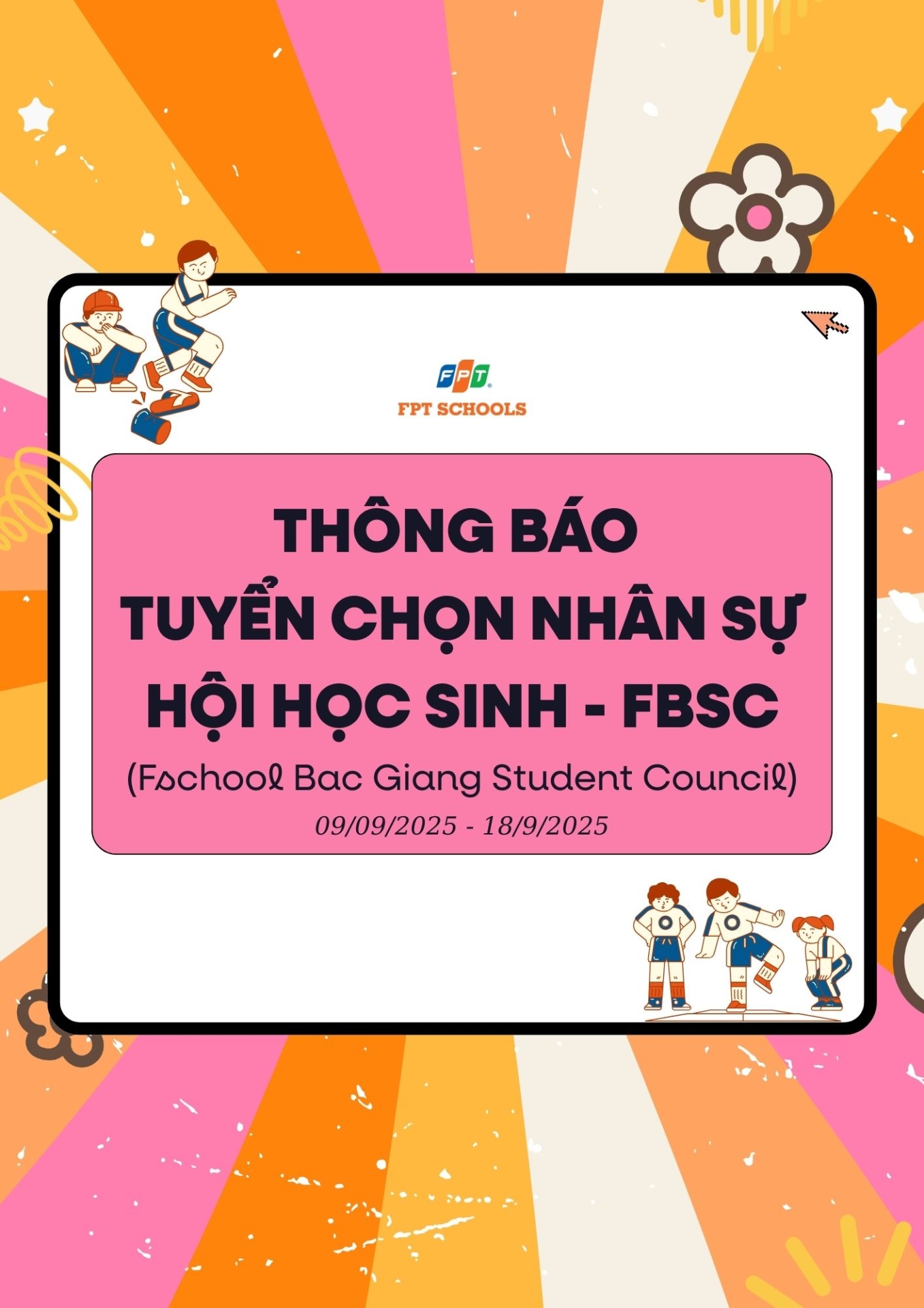 Đối tượng đăng ký: Học sinh các khối THCS, THPT đang theo học tại Trường Tiểu học, THCS và THPT FPT Bắc Giang (trừ học sinh khối 9 và 12); riêng Tiểu ban Kỷ luật tuyển chọn thêm học sinh khối 3 và 4.