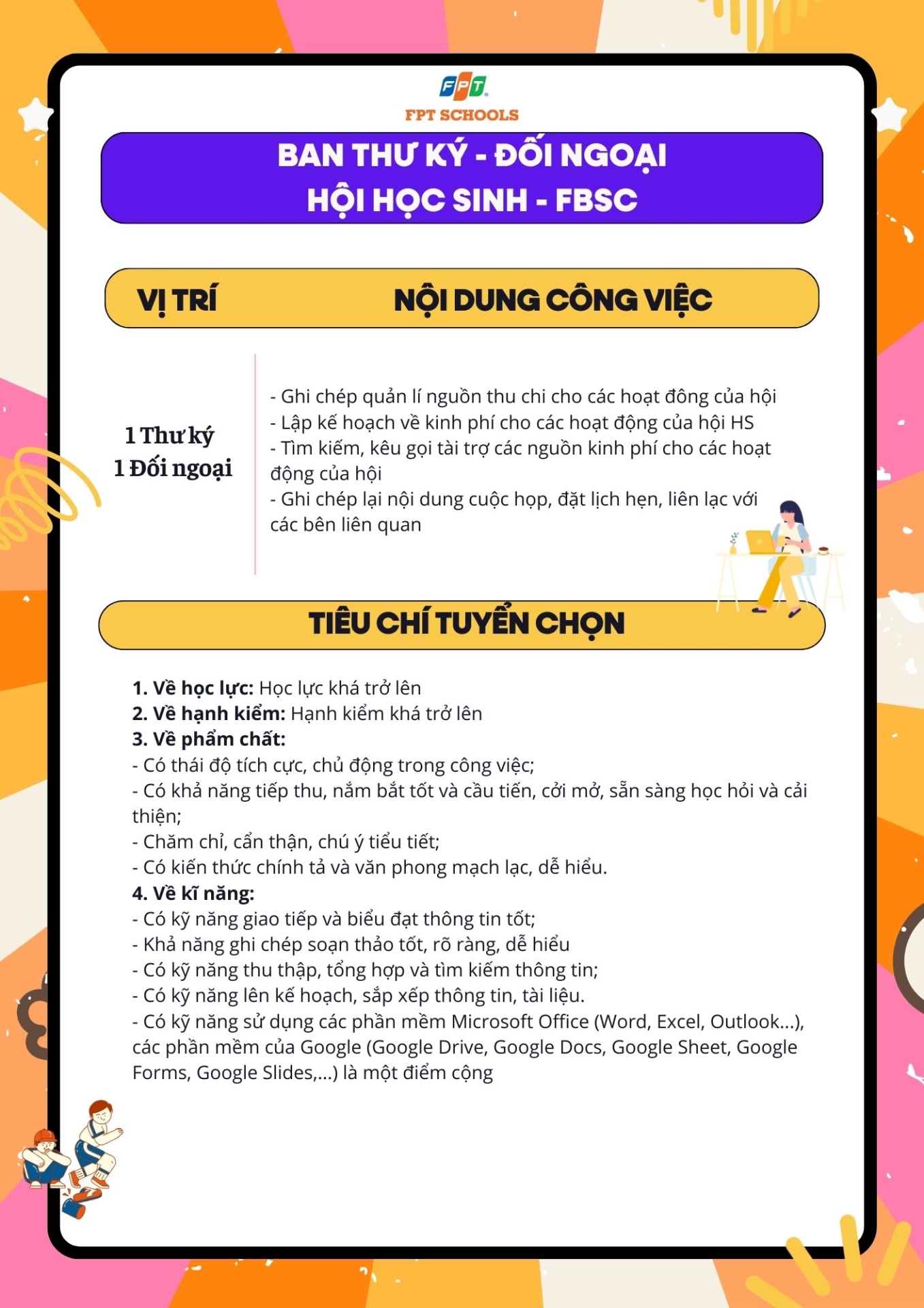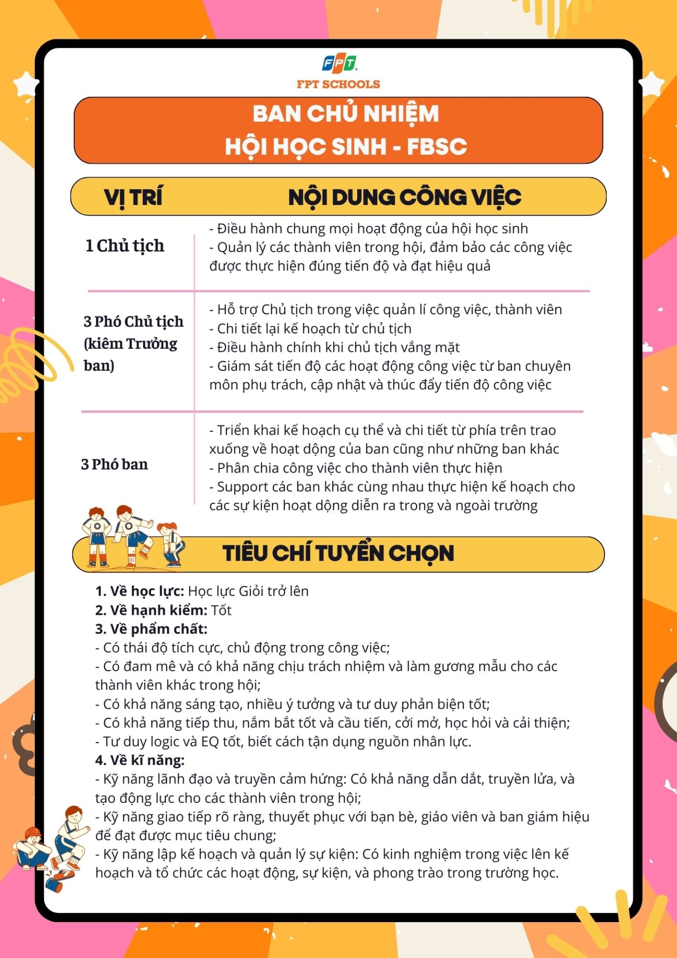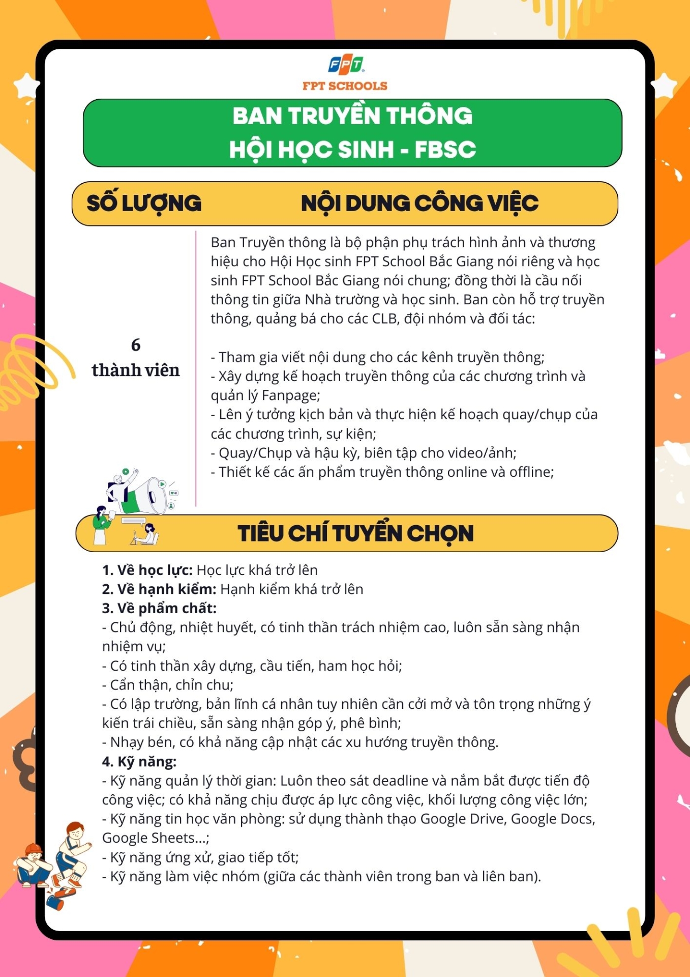 Đối tượng đăng ký: Học sinh các khối THCS, THPT đang theo học tại Trường Tiểu học, THCS và THPT FPT Bắc Giang (trừ học sinh khối 9 và 12); riêng Tiểu ban Kỷ luật tuyển chọn thêm học sinh khối 3 và 4.