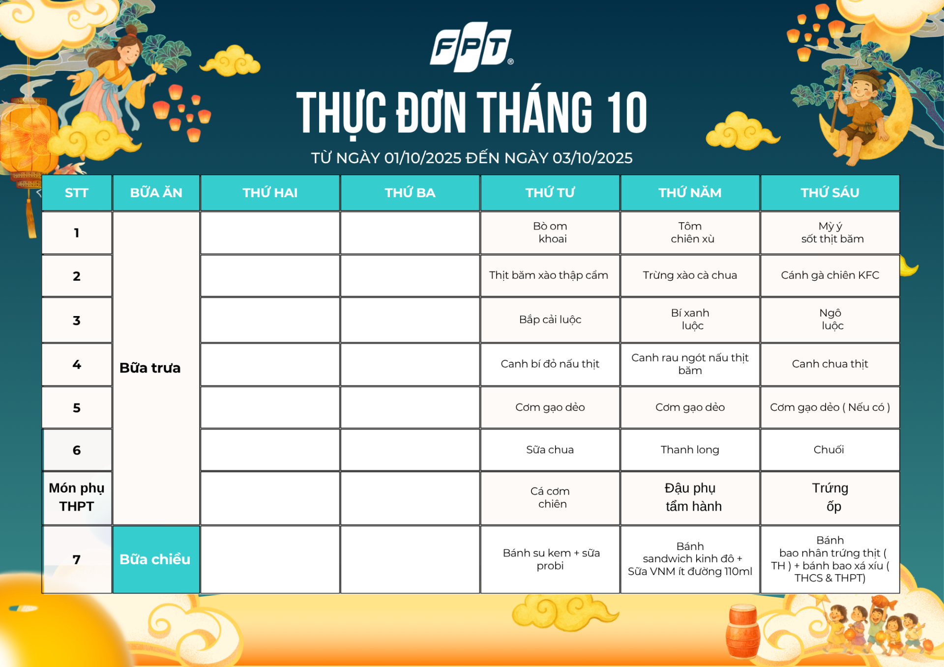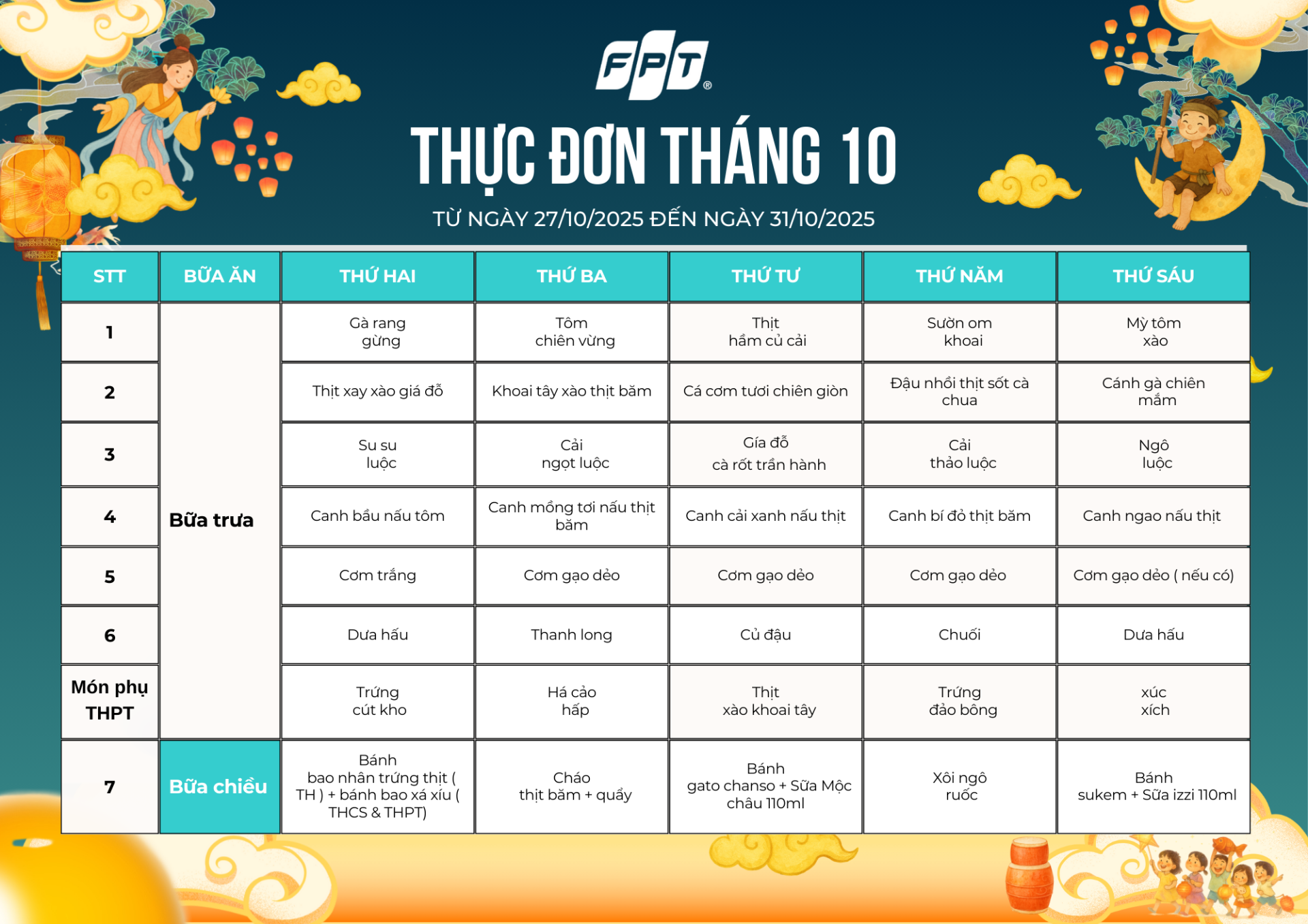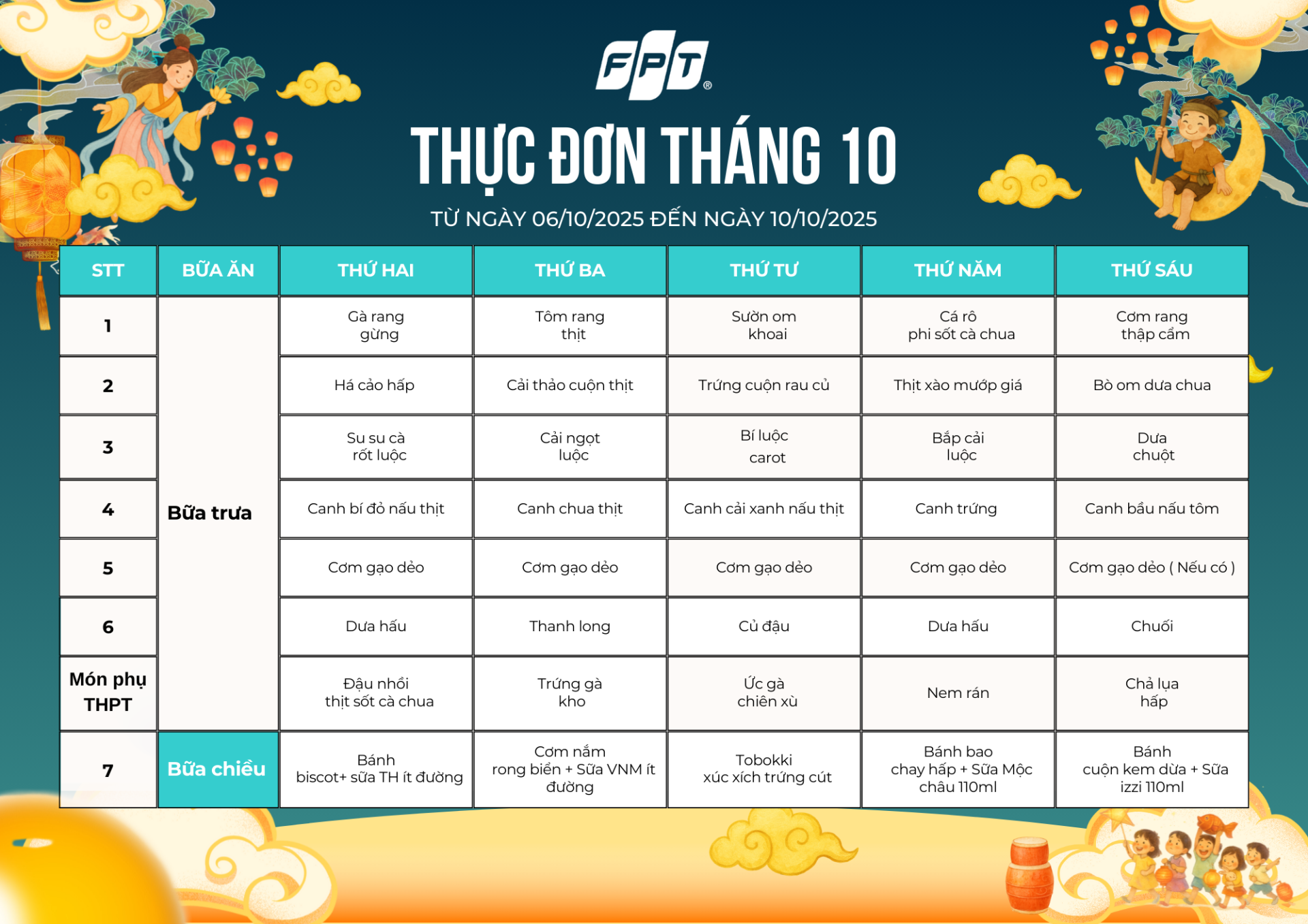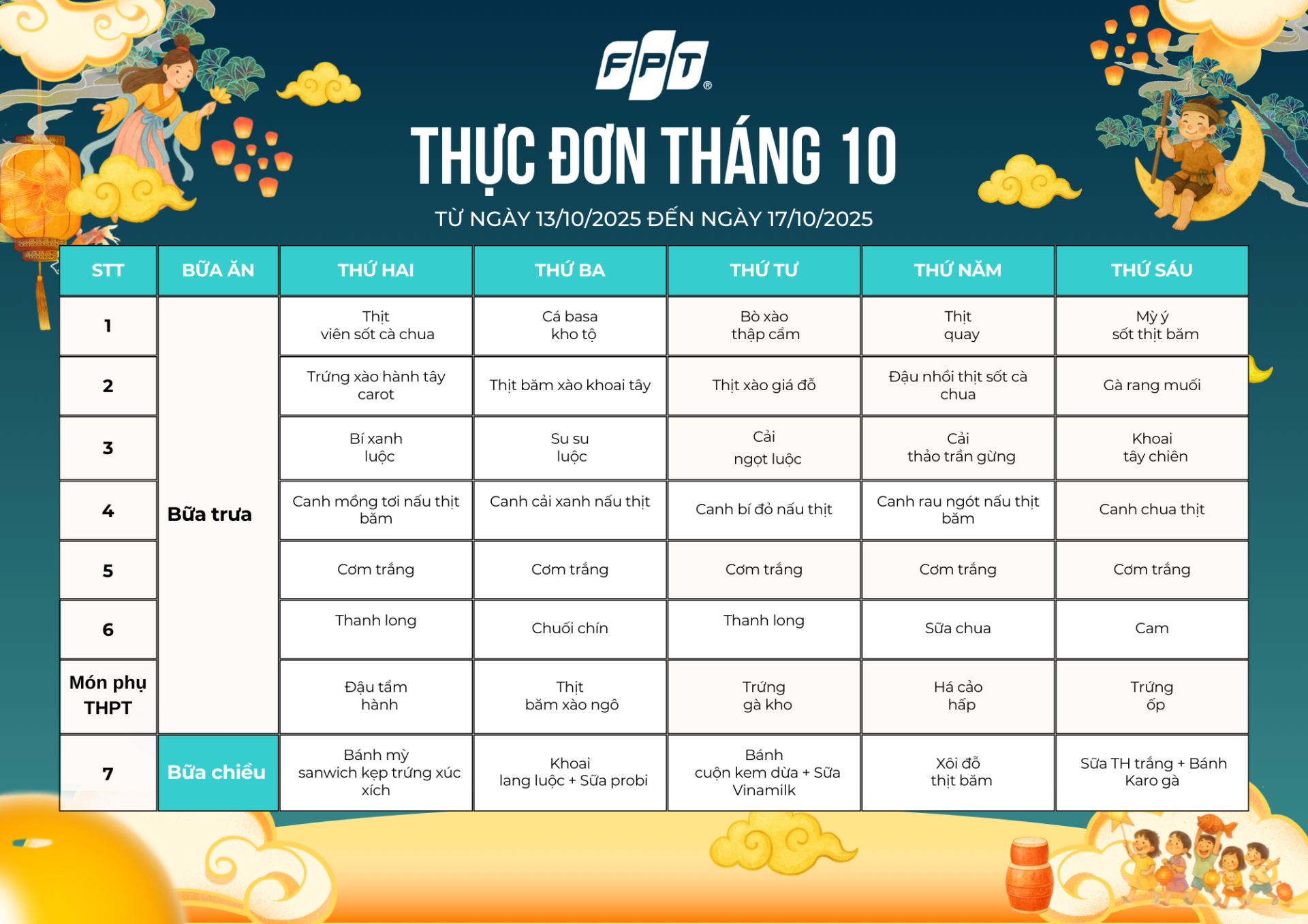 Xin mời quý phụ huynh và các con học sinh cùng khám phá Thực đơn từ tuần 1 đến tuần 5 tháng 10/2025 của Trường Tiểu học, THCS và THPT FPT School Bắc Giang.