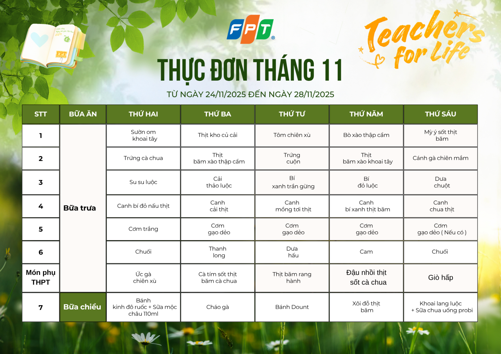 Xin mời quý phụ huynh và các con học sinh cùng khám phá Thực đơn từ tuần 1 đến tuần 4 tháng 11/2025 của Trường Tiểu học, THCS và THPT FPT School Bắc Giang.