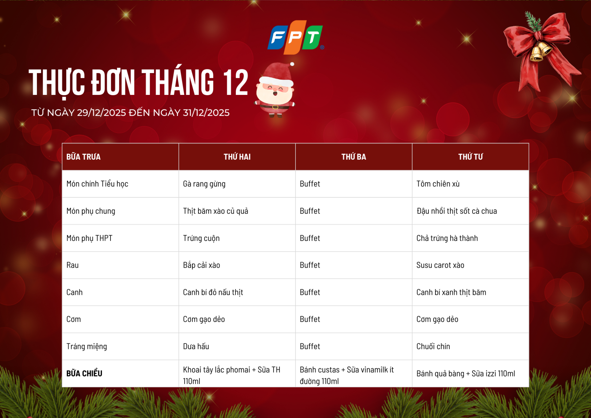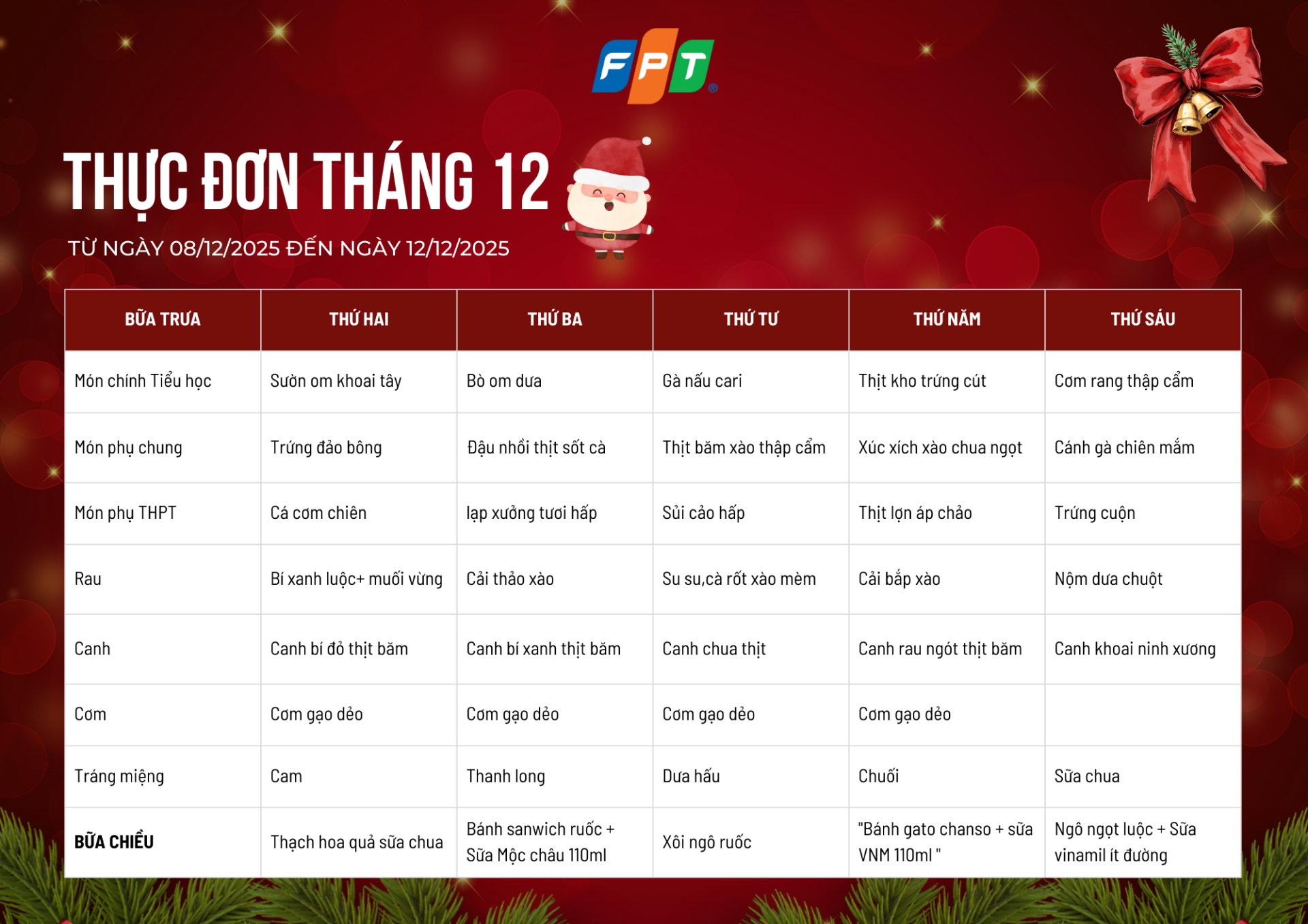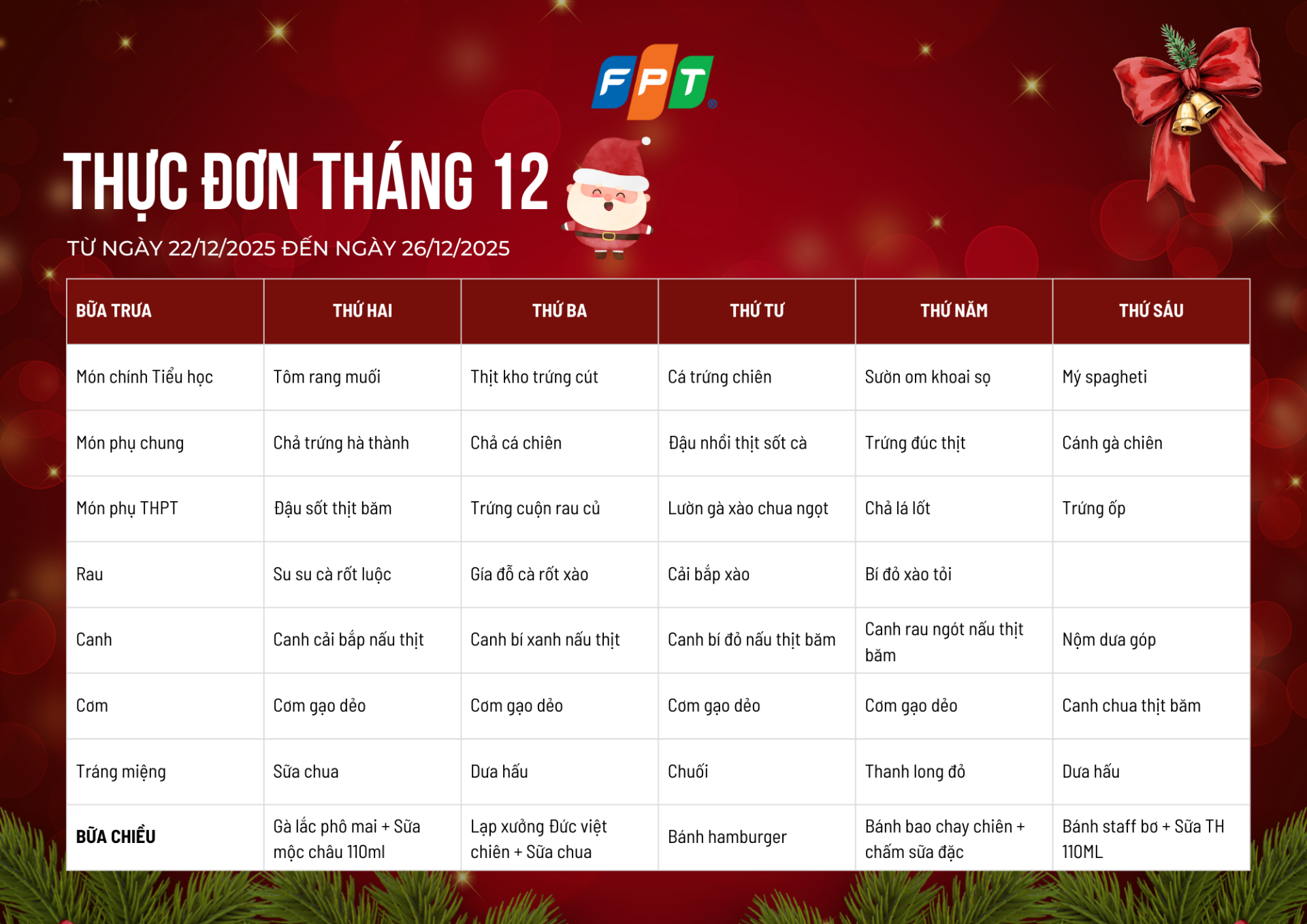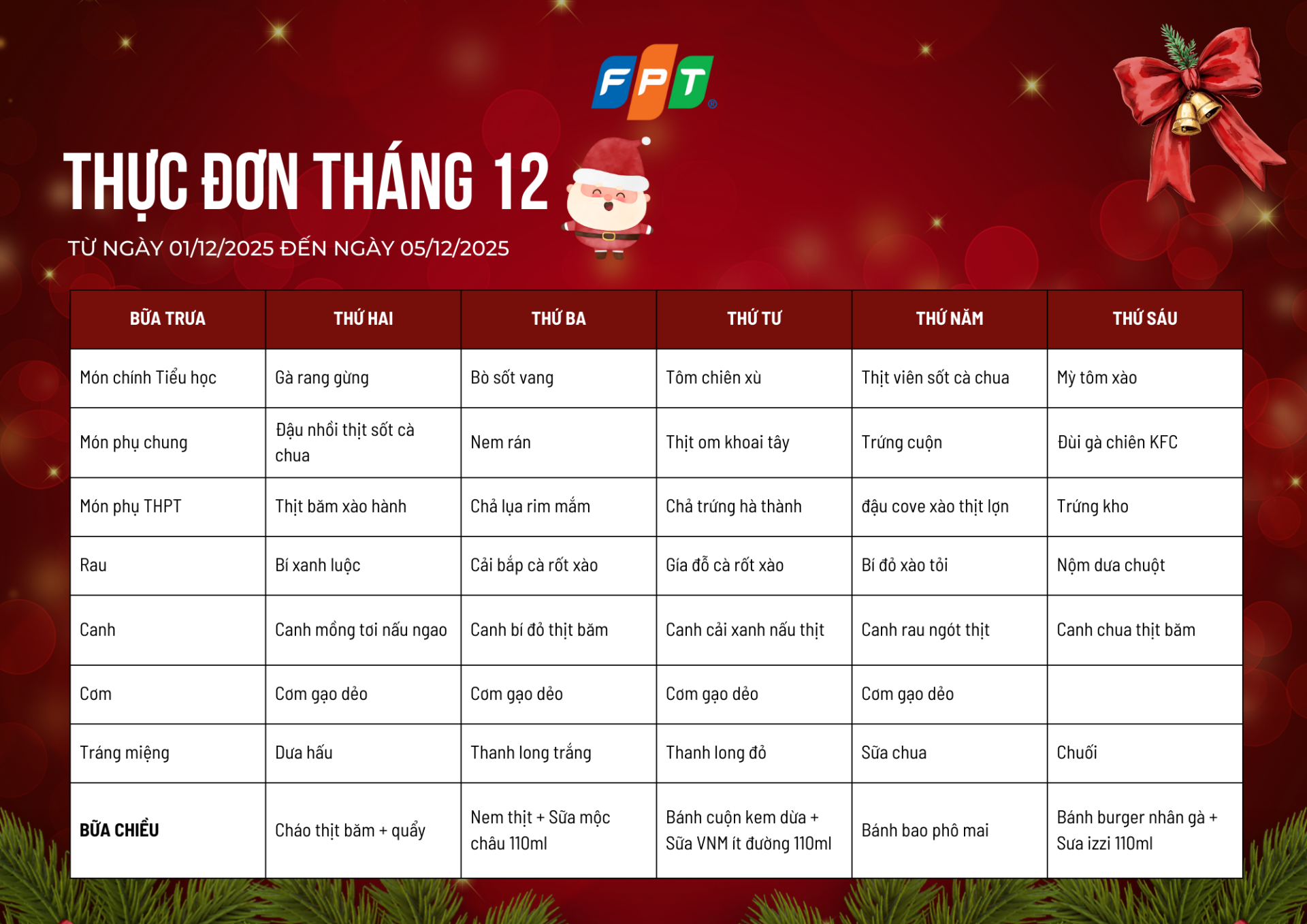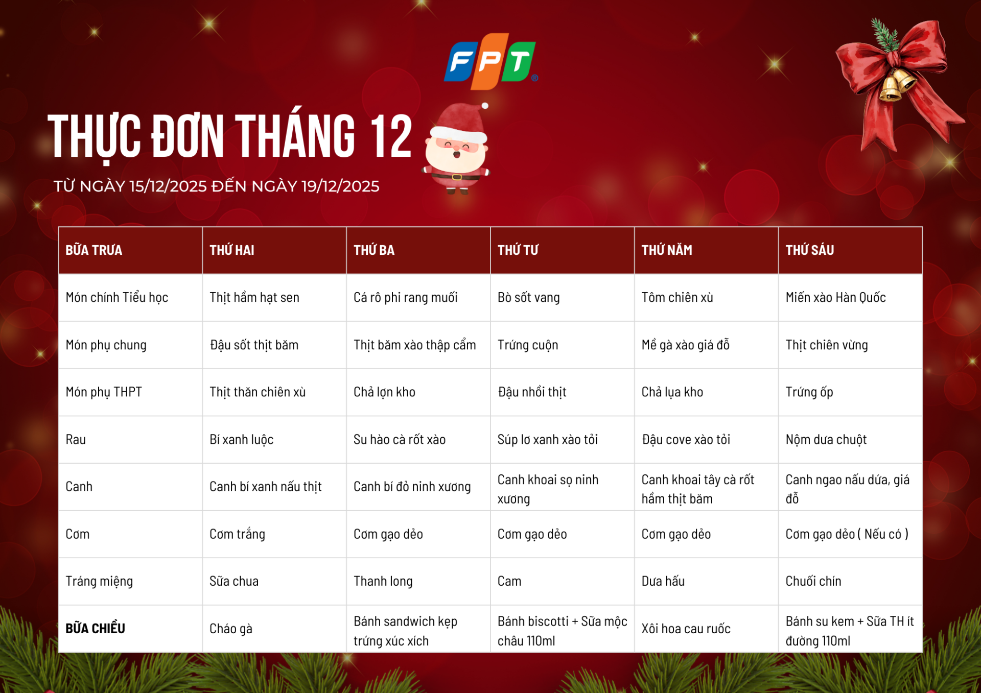 Kính mời quý phụ huynh và các con học sinh cùng khám phá Thực đơn tháng 12/2025 (tuần 1 đến tuần 5) dành cho học sinh Tiểu học, THCS và THPT FPT School Bắc Giang.